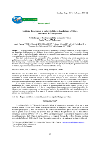 Aude Nuscia Taïbi, Mahefa Mamy Rakotoarisoa, Laura Champin, Cyril Fleurant, Théodore Razakamanana, et al.. Méthode d’analyse de la vulnérabilité aux inondations à Toliara (sud-ouest Madagascar). Geo-Eco-Trop, 2017, 41 (3), pp.455-462. ⟨hal-01703318⟩