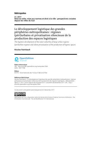 Nicolas Raimbault. Le développement logistique des grandes périphéries métropolitaines : régimes (péri)urbains et privatisation silencieuse de la production des espaces logistiques. Métropoles, ENTPE, 2017. ⟨hal-02154940⟩