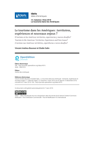 Vincent Andreu-Boussut, Elodie Salin. Le tourisme dans les Amériques : territoires, expériences et nouveaux enjeux ?. IdeAs : idées d'Amérique, Institut des Amériques (France), 2018. ⟨halshs-02073790⟩