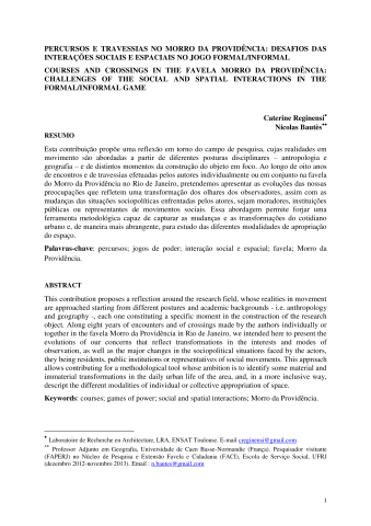 Catherine Reginensi, Nicolas Bautès. Percursos e travessias no Morro da Providência: Desafios das interaçoes sociais e espaciais no jogo formal/informal. Libertas. Revista da Faculdade de Serviço Social, 2013, 13 (2), pp.2. ⟨halshs-00930233⟩