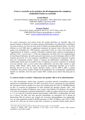 Gerald Billard, François Madoré. Fortress Australia ou les prémices du développement des complexes résidentiels fermés en Australie. Urbanisme, Publications d'architecture et d'urbanisme, 2004, pp.56-60. ⟨hal-01626457⟩