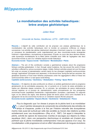 Julien Noel. La mondialisation des activités halieutiques : brève analyse géohistorique. M@ppemonde, Maison de la géographie, 2013. ⟨hal-01654391⟩