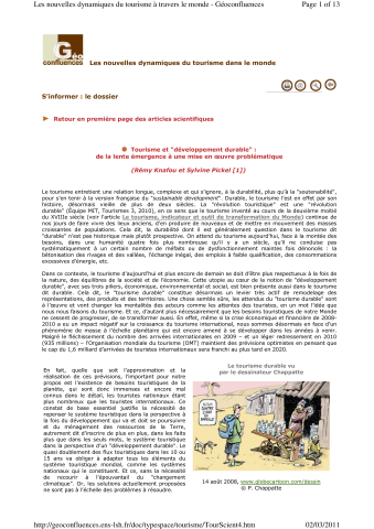 Sylvine Pickel-Chevalier, Rémy Knafou. Tourisme et développement durable : de la lente émergence à une mise en œuvre problématique . Géoconfluences, Lyon: École normale supérieure de Lyon DGESCO, 2011, Les nouvelles dynamiques du tourisme dans le monde, http://geoconfluences.ens-lyon.fr/doc/typespace/tourisme/TourScient4.htm. ⟨hal-01572134⟩