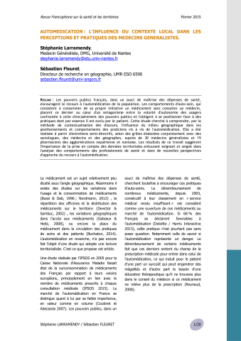 Stephanie Larramendy, Sébastien Fleuret. Automédication : l’influence du contexte local dans les perceptions et pratiques des médecins généralistes. Revue francophone sur la santé et les territoires, hypotheses.org, 2015, pp.000. ⟨hal-01187844v2⟩
