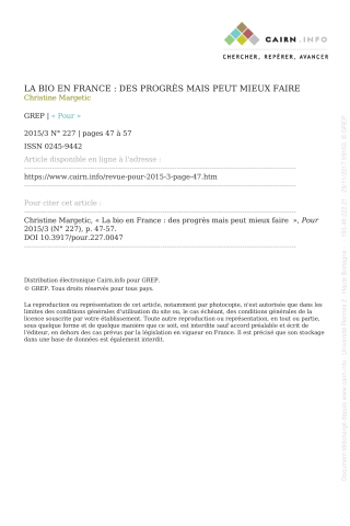 Christine Margetic. La bio en France : des progrès mais peut mieux faire. Pour : enquêtes et témoignages, Groupe de recherche pour l'éducation et la prospective (France) (GREP), 2015, 227 (3), pp.47 - 57 ⟨10.3917/pour.227.0047⟩. ⟨hal-01651483⟩
