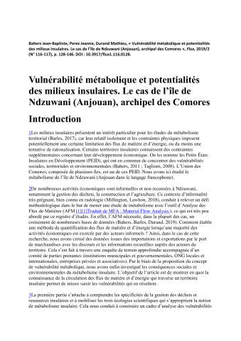 Jean-Baptiste Bahers, Jeanne Perez, Mathieu Durand. Vulnérabilité métabolique et potentialités des milieux insulaires. Le cas de l’île de Ndzuwani (Anjouan), archipel des Comores. Flux - Cahiers scientifiques internationaux Réseaux et territoires, Metropolis / Université Paris-Est Marne la Vallée 2019, N°128-146 (2), pp.128. ⟨10.3917/flux1.116.0128⟩. ⟨halshs-02462461⟩