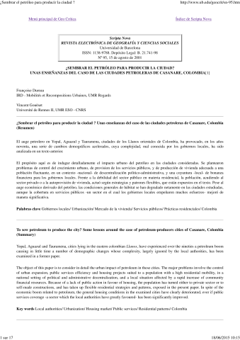 Françoise Dureau, Vincent Gouëset. ¿Sembrar el petróleo para producir la ciudad ?: Unas enseñanzas del caso de las ciudades petroleras de Casanare, Colombia. Scripta Nova. Revista Electronica de Geographia y Ciencias Sociales, Universitat de Barcelona, 2001, V (95), pp.25. ⟨halshs-00291320⟩