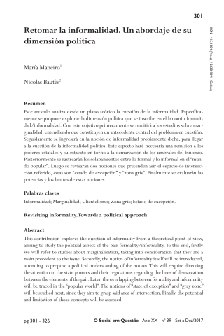 María Maneiro, Nicolas Bautes. Retomar la informalidad. Un abordaje de su dimensión política. O Social em Questão. Revista do Departamento de Serviço Social, PUC-RIo, 2018, XX (39), pp.301-326. ⟨halshs-02383464⟩