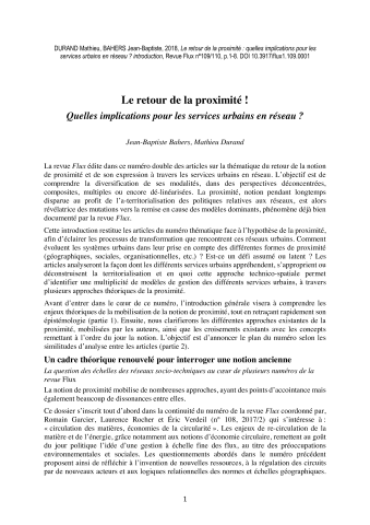 Jean-Baptiste Bahers, Mathieu Durand. Le retour de la proximité ! Quelles implications pour les services urbains en réseau ?. Flux - Cahiers scientifiques internationaux Réseaux et territoires, Metropolis / Université Paris-Est Marne la Vallée 2017, 109-110 (3), pp.1. ⟨10.3917/flux1.109.0001⟩. ⟨halshs-02195095⟩