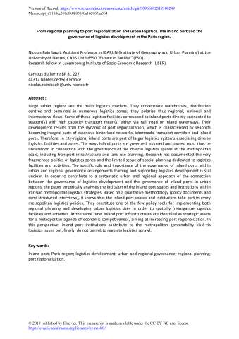 Nicolas Raimbault. From regional planning to port regionalization and urban logistics. The inland port and the governance of logistics development in the Paris region. Journal of Transport Geography, Elsevier, 2019, 78, pp.205-213. ⟨10.1016/j.jtrangeo.2019.06.005⟩. ⟨hal-02168890⟩