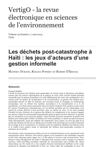 Mathieu Durand, Roxana Popescu, Robert d'Ercole. Les déchets post-catastrophe à Haïti : les jeux d’acteurs d’une gestion informelle. Vertigo, Paris : Avancées cinématographiques, 2015, ⟨10.4000/vertigo.15970⟩. ⟨halshs-02195175⟩