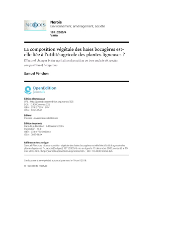 Samuel Perichon. La composition végétale des haies bocagères est-elle liée à l’utilité agricole des plantes ligneuses ?. Norois, Presses universitaires de Rennes, 2009, ⟨10.4000/norois.325⟩. ⟨halshs-02424844⟩