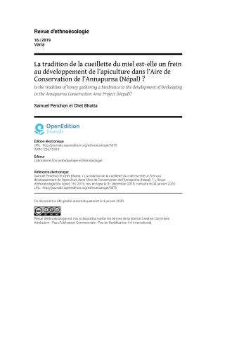 Samuel Perichon, Chet Bhatta. La tradition de la cueillette du miel est-elle un frein au développement de l'apiculture dans l'Aire de Conservation de l'Annapurna (Népal) ?. Revue d’ethnoécologie, Paris : Revue d’ethnoécologie, Museum national d’histoire naturelle, 2019. ⟨hal-02427855⟩