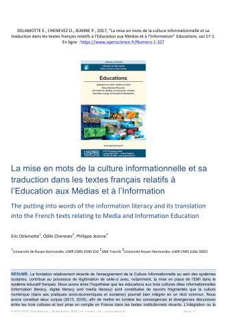 Eric Delamotte, Odile Chenevez,, Philippe Jeanne. La mise en mots de la culture informationnelle et sa traduction dans les textes français relatifs à l’Education aux Médias et à l’Information. Éducations, ISTE OpenScience, 2017. ⟨hal-02319557⟩