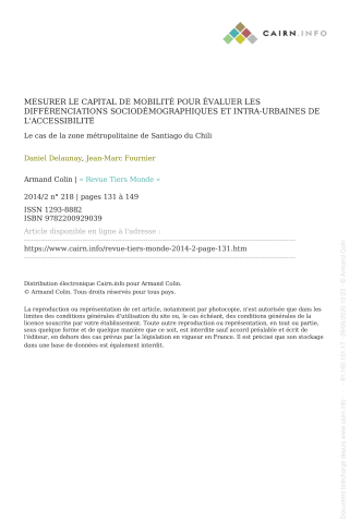 Daniel Delaunay, Jean-Marc Fournier. Mesurer le capital de mobilité pour évaluer les différenciations sociodémographiques et intra-urbaines de l'accessibilité. Le cas de la zone métropolitaine de Santiago du Chili. Revue Tiers Monde, Armand Colin, 2014. ⟨halshs-02861699⟩
