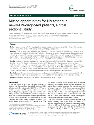 Karen Champenois, Anthony Cousien, Lise Cuzin, Stéphane Le Vu, Sylvie Deuffic-Burban, et al.. Missed opportunities for HIV testing in newly-HIV-diagnosed patients, a cross sectional study.. BMC Infectious Diseases, BioMed Central, 2013, 13 (1), pp.200. ⟨10.1186/1471-2334-13-200⟩. ⟨inserm-00822062⟩