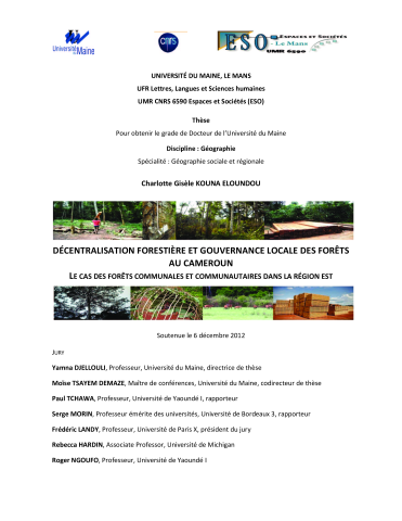 Charlotte Gisèle Kouna Eloundou. Décentralisation forestière et gouvernance locale des forêts au Cameroun : le cas des forêts communales et communautaires dans la région Est. Géographie. Université du Maine, 2012. Français. ⟨NNT : 2012LEMA3012⟩. ⟨tel-00795695⟩
