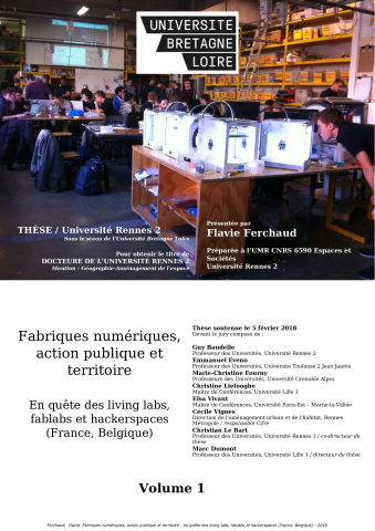 Flavie Ferchaud. Fabriques numériques, action publique et territoire : en quête des living labs, fablabs et hackerspaces (France, Belgique). Architecture, aménagement de l'espace. Université Rennes 2, 2018. Français. ⟨NNT : 2018REN20010⟩. ⟨tel-01743793v2⟩