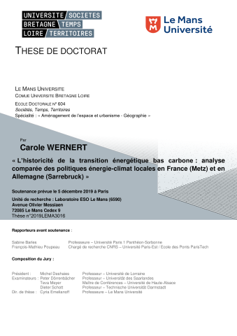 Carole Wernert. L'historicité de la transition énergétique bas carbone : analyse comparée des politiques énergie-climat locales en France (Metz) et en Allemagne (Sarrebruck). Etudes de l'environnement. Le Mans Université, 2019. Français. ⟨NNT : 2019LEMA3016⟩. ⟨tel-02881387⟩