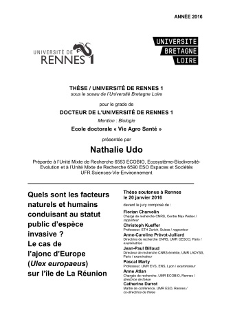 Nathalie Udo. Quels sont les facteurs naturels et humains conduisant au statut invasif ? Le cas de l'ajonc (Ulex europaeus) sur l'île de La Réunion. Environnement et Société. Université Rennes 1, 2016. Français. ⟨NNT : 2016REN1S004⟩. ⟨tel-01357947⟩