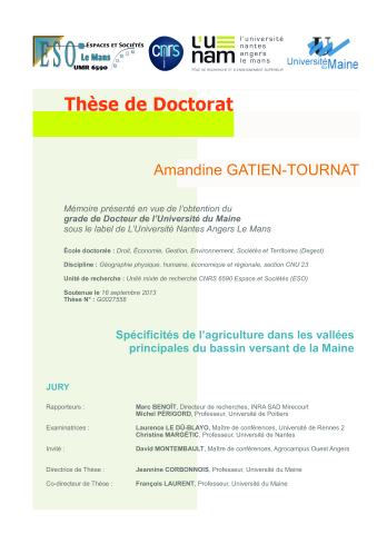 Amandine Gatien-Tournat. Spécificités de l'agriculture dans les vallées principales du bassin versant de la Maine. Géographie. Université du Maine, 2013. Français. ⟨NNT : 2013LEMA3003⟩. ⟨tel-00949507⟩