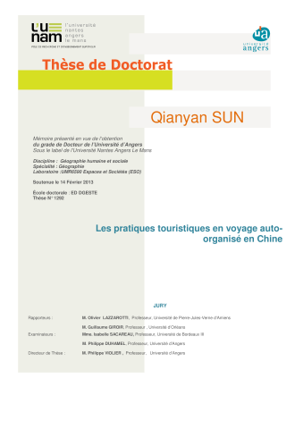 Qianyan Sun. Les pratiques touristiques en voyage auto-organisé en Chine. Géographie. Université d'Angers, 2013. Français. ⟨tel-00845903⟩
