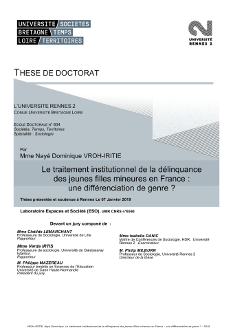 Naye Dominique Iritie. Le traitement institutionnel de la délinquance des jeunes filles mineures en France : une différenciation de genre ?. Sociologie. Université Rennes 2, 2019. Français. ⟨NNT : 2019REN20014⟩. ⟨tel-02148788⟩