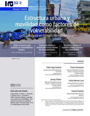 Pablo Vega Centeno, Jérémy Robert, Florent Demoraes, Carlos Moreno Luna, Vincent Gouëset. Estructura urbana y patrones de movilidad como factores de vulnerabilidad socio-espacial - Lima y Bogotá en tiempos de cuarentena. Bitácora Urbano Territorial, 2022, La vida en las ciudades en tiempos de COVID-19, 32 (II), pp.47-62. ⟨10.15446/bitacora.v32n2.99425⟩. ⟨hal-03683792⟩
