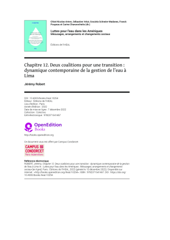 Jérémy Robert. Chapitre 12. Deux coalitions pour une transition : dynamique contemporaine de la gestion de l’eau à Lima. Luttes pour l’eau dans les Amériques: Mésusages, arrangements et changements sociaux, Éditions de l’IHEAL, pp.278-299, 2022, 9782371541467. ⟨10.4000/books.iheal.10254⟩. ⟨hal-03911556⟩