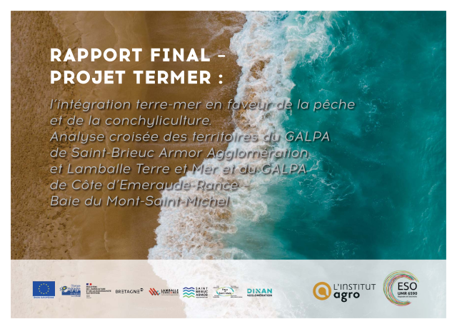 Initié par le Pôle halieutique, mer et littoral de l’Institut Agro Rennes-Angers, le projet TERMER est soutenu par le FEAMP (Fonds Européen pour les Affaires Maritimes et la Pêche) et le Conseil Régional de Bretagne dans le cadre des Groupes d’Action Locale Pêche et Aquaculture du territoire de Saint-Brieuc Armor Agglomération et Lamballe Terre et Mer (SBAALTM) et de celui de Côte d’Emeraude - Rance - Baie du Mont-Saint-Michel (CERBM). Il vise à améliorer la prise en charge des besoins des activités professionnelles de pêche et de conchyliculture au sein des documents de planification spatiale (SCoT), de gestion environnementale (Natura 2000), et de gestion de l’eau (SAGE) et d’accompagner les actrices et acteurs publics locaux dans une gestion intégrée de l’espace terre et mer. Ce rapport présente l’étude menée : les territoires, la méthodologie et les principaux résultats. À partir de l’analyse de la littérature scientifique et de celle produite par chaque territoire (SCoT, SAGE et Natura 2000), d’une revue de presse (570 articles), d’une soixantaine d’entretiens, d’ateliers participatifs et d’un voyage d’études sur le bassin de Thau, ce travail met en évidence : - les multiples définitions des enjeux terre-mer sur les deux territoires d’études ; - les différentes manières de prendre en charge ces enjeux pour les traiter ; - les différents réseaux à travers lesquels les acteurs et actrices de la pêche et de la conchyliculture s’impliquent dans la gouvernance locale. Sur la base de ces résultats, une feuille de route pour mettre en œuvre une gestion intégrée de l’espace littoral est proposée.
