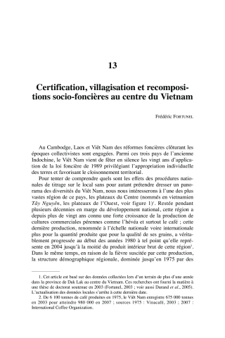 et Viêt Nam des réformes foncières clôturant les époques collectivistes sont engagées. Parmi ces trois pays de l'ancienne Indochine, le Viêt Nam vient de fêter en silence les vingt ans d'application de la loi foncière de 1989 privilégiant l'appropriation individuelle des terres et favorisant le cloisonnement territorial. Pour tenter de comprendre quels sont les effets des procédures nationales de titrage sur le local sans pour autant prétendre dresser un panorama des diversités du Viêt Nam, nous nous intéresserons à l'une des plus vastes région de ce pays, les plateaux du Centre (nommés en vietnamien Tây Nguyên, les plateaux de l'Ouest, voir figure 1) 1. Restée pendant plusieurs décennies en marge du développement national, cette région a depuis plus de vingt ans connu une forte croissance de la production de cultures commerciales pérennes comme l'hévéa et surtout le café ; cette dernière production, renommée à l'échelle nationale voire internationale plus pour la quantité produite que pour la qualité de ses grains, a véritablement progressée au début des années 1980 à tel point qu'elle représente en 2004 jusqu'à la moitié du produit intérieur brut de cette région 2. Dans le même temps, en raison de la fièvre suscitée par cette production, la structure démographique régionale, dominée jusqu'en 1975 par des