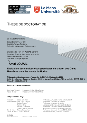 Quelles que soient leurs origines biogéographiques ou leurs degrés d’artificialisation, les forêts du globe sont la source d’une large gamme de services écosystémiques (SE) de toutes sortes. Cependant, la qualité et la quantité des services rendus dépendent du type de forêt étudié selon son contexte phytogéographique. Notre objectif est de transposer le concept de SE, en particulier l’évaluation de la capacité d’offre et la demande en SE forestiers, dans le contexte méditerranéen spécifique des montagnes de l’Afrique du Nord, pour lequel cette question est encore à l’ébauche et où l’accès aux données nécessaires à l’évaluation reste difficile. Notre travail présente une démarche introductive, permettant de mettre en place des jalons méthodologiques et scientifiques s’appuyant sur des données de télédétection en libre accès et des traitement géospatiaux déjà éprouvés, associés à des relevés phytoécologiques et complétés par des méthodes d’enquête afin de pouvoir évaluer qualitativement et quantitativement les SE procurés par les forêts en Algérie. Nous ciblons particulièrement la forêt des Ouled Hannèche, située dans les monts du Hodna. Notre démarche s’inscrit dans le cadre conceptuel d’unité de fourniture de SE (SPU) décliné à plusieurs niveaux écologiques organisationnels et à différentes échelles spatiales. En supplément d’une approche générale estimant la potentialité de la forêt à fournir des SE, nous avons mis l’accent sur un SE de régulation climatique celui de l’évapotranspiration dont les caractéristiques sont révélatrices du fonctionnement éco-hydrologique des écosystèmes forestiers. En définitive, nos résultats servent comme base utile à l’aménagement du territoire et la conservation de la biodiversité.
