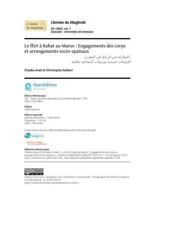 In Morocco, the possibility of flirting in the public space is evident in many ways. However, heterosexual seduction practices in Morocco are not to be taken for granted in a country where bodies, especially women’s bodies, are subject to strong political and social control. Our article intends to break with the dominant discourses and ethnocentric visions, in Morocco as in France, which consider sexualities in Morocco only through the prism of religion and women’s passivity. This article deals specifically with issues of power and bodies in the public space: what is possible and what is not. Our analysis focuses on unmarried Moroccan heterosexual couples. It is drawn from exploratory surveys (non-participant observations in selected locations during several consecutive days and 15 semistructured interviews with Moroccan couples) conducted in April 2016 in Rabat, the country’s administrative capital. According to the results of our qualitative survey, the ways of flirting before marriage, potentially reprehensible in the eyes of society, are quite homogeneous. The article shows that young women and men innovate in terms of strategies for living out their expressions of intimacy through what we have called « geographical bubble ». These bubbles, identified beforehand, constitute places that both protect them from indiscreet and reproach ful eyes and allow for intimacy. Couples, and especially women, pay crucial attention to the choice of locations for their romantic encounters: they want to avoid being seen, while remaining safe to flirt. The article is organized in two parts. The first presents the restrictive legal and moral framework of sexuality in Morocco, while highlighting a recent dynamic of social and sexual transition. This transition is eminently linked to the publicization of issues of individual and sexual freedom, the emergence of which has made it possible to debate the sexuality of Moroccan men and women, helping to normalize it and make it legitimate whether it is expressed within or outside of marriage. The second part of the paper focuses more specifically on two locations of the survey. The Printemps café, a « geographical bubble » in the heart of downtown Rabat, offers a private space open to the public where young couples are very present, much more so than elsewhere in the city, and allows flirting. The cornices and beaches are also places where young couples can meet, away from prying eyes, as shown in the photographs that illustrate the article. The couples behave like « teams », as Erving Goffman (1973) formulates it, operating jointly a strict control of their gestures, representations, body distances and finally of the glances coming from outside. Complicity within the couple therefore, but also between couples in the same place. These precautions underlie the existence of these « geographical bubbles » and of flirting within them, at a distance from the control of the authorities: the intimate and individual experiences are thus also revealed to be a group practice and conceived with regard to the group. The « geographical bubbles » thus make it possible to preserve the respectability of young women (especially) within families and to avoid the mechanisms of exclu sion and marginalization. In the end, they are evidence of territorialized practices that contribute, even if modestly, to questioning dominant heteronormative behaviors. The couples met during the survey, by their mere presence in the public space, participate in the deconstruction of institutional gender behaviors and thus in a localized process of gender mixing.