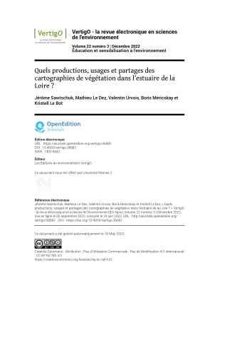 Cette étude interroge les méthodes, typologies, moyens de diffusion et de partage des cartographies de végétation. Différentes sources d’informations sont mobilisées pour décrire les pratiques sur le territoire français de l’estuaire de la Loire : une analyse documentaire sur la production et l’usage des cartographies de végétation, une synthèse des demandes de données effectuées auprès d’un organisme ressource et une enquête réalisée auprès des professionnels. Les résultats sont analysés de façon à déterminer si les besoins diffèrent entre les catégories d’acteurs et sont mis en perspective avec les outils de diffusion actuellement disponibles. La synthèse bibliographique a permis de recenser 55 cartes de végétation et d’habitats éditées entre 1979 et 2020. La demande de cartes est croissante et peut être mise en lien avec l’évolution des politiques publiques d’aménagement et la prise en compte grandissante des problématiques environnementales. Les usages principaux concernent la réalisation d’études d’impacts, la gestion des milieux et l’aménagement. La désignation du site Natura 2000 a impulsé la construction d’une connaissance partagée sur ce territoire. Les connaissances de la dynamique des végétations restent encore partielles et requièrent des typologies standardisées pour pouvoir comparer les cartographies entre elles et mieux appréhender les évolutions de l’estuaire. La production et la diffusion de ces documents d’aide à la décision nécessitent des moyens, notamment humains, pour animer un réseau d’échanges de données environnementales entre utilisateurs et producteurs qui ne doit pas se limiter à une plateforme numérique.