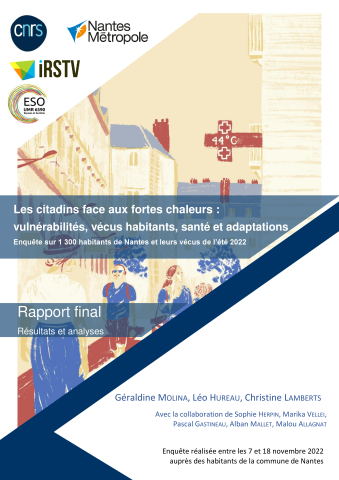 Géraldine Molina, Hureau Léo, Christine Lamberts. Les citadins face aux fortes chaleurs : vulnérabilités, vécus habitants, santé et adaptations. : Enquête sur 1 300 habitants de Nantes et leurs vécus de l’été 2022. rapport du programme de recherche CNRS - IRSTV - Nantes Métropole « Habitants des villes et climat ». 2023. ⟨hal-04172893⟩