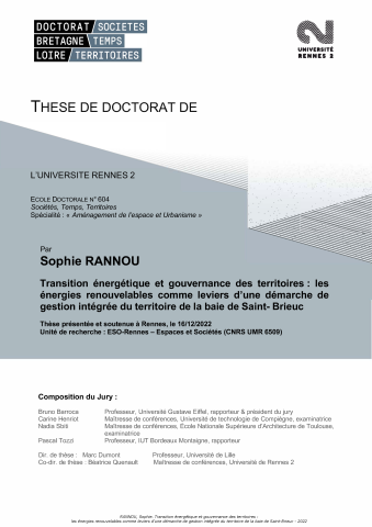 Sophie Rannou. Transition énergétique et gouvernance des territoires : les énergies renouvelables comme leviers d’une démarche de gestion intégrée du territoire de la baie de Saint-Brieuc. Sociologie. Université Rennes 2, 2022. Français. ⟨NNT : 2022REN20058⟩. ⟨tel-04190372⟩