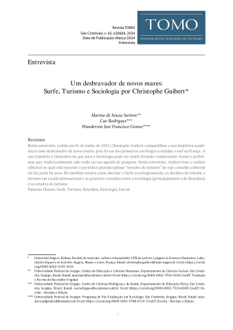 Nesta entrevista, cedida em 01 de Junho de 2023, Christophe Guibert compartilhou a sua trajetória acadêmica como desbravador de novos mares, pois foi um dos primeiros sociólogos a estudar o surf na França. A sua trajetória é ilustrativa de que para a Sociologia pode ser muito fecundo compreender temas e problemas que, tradicionalmente, não estão na sua agenda de pesquisa. Nesta entrevista, Guibert traz o cenário editorial no qual está inserido o periódico pluridisciplinar “mondes du turisme” de cujo conselho editorial ele faz parte há anos. Ele também mostra como abordar o Surfe sociologicamente, os desafios de estudar o turismo em escala internacional e as possíveis conexões entre a sociologia (principalmente a de Bourdieu) e os estudos do turismo.
