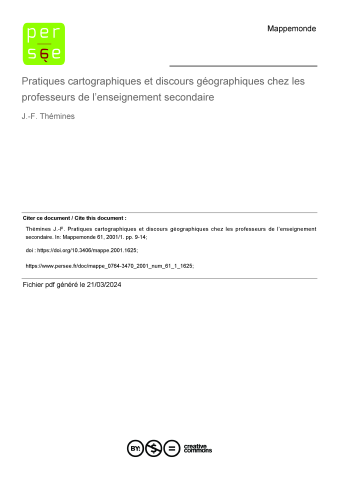 J.-F. Thémines. Pratiques cartographiques et discours géographiques chez les professeurs de l’enseignement secondaire. M@ppemonde, 2001, 61 (1), pp.9-14. ⟨10.3406/mappe.2001.1625⟩. ⟨hal-04631559⟩