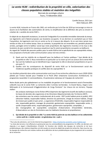 Camille Devaux, Rémi Habouzit. La vente HLM : redistribution de la propriété en ville, valorisation des classes populaires stables et maintien des inégalités Biennale de sociologie urbaine Tours, 7-9 décembre 2022. Biennale de Sociologie Urbaine, Association française de sociologie, Dec 2022, Tours, France. ⟨halshs-04991584⟩