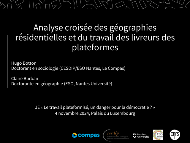 Hugo Botton, Claire Burban. Analyse croisée des géographies résidentielles et du travail des livreurs des plateformes. JE « Le travail plateformisé un danger pour la démocratie », Fabien Lemozy; Stéphane Le Lay, Nov 2024, Palais du Luxembourg Sénat, France. ⟨hal-05127323⟩