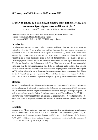 Emma Barreau, Thibault Deschamps, Mathilde Plard. L’activité physique à domicile, meilleure arme antichute chez des personnes âgées vigoureuses de 80 ans et plus ?. 21ème congrès international de l'Association des Chercheurs en Activités Physiques et Sportives, Association des Chercheurs en Activités Physiques et Sportives, Oct 2025, Poitiers, France. ⟨hal-05416692⟩