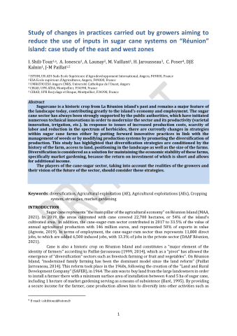 I. Shili-Touzi, A. Ionescu, A. Launay, M. Vaillant, Hélène Jarousseau, et al.. Study of changes in practices carried out by growers aiming to reduce the use of inputs in sugarcane systems on “Réunion” island: case study of the east and west zones. Acta Horticulturae, 2023, 1366, pp.443-454. ⟨10.17660/ActaHortic.2023.1366.55⟩. ⟨hal-05594642⟩