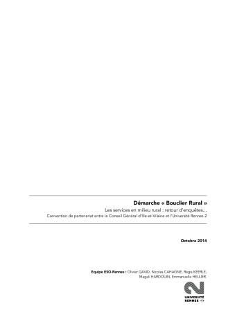 Olivier David, Nicolas Cahagne, Régis Keerle, Magali Hardouin, Emmanuelle Hellier. Démarche « Bouclier Rural », Les services en milieu rural : retour d’enquêtes. : Volet 1. [Rapport de recherche] Université Rennes 2 - Conseil Départemental 35. 2014. ⟨halshs-01346741⟩