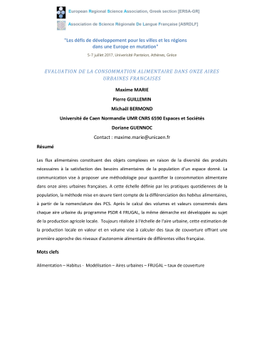 Evaluation de la consommation alimentaire dans onze aires urbaines françaises