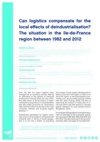 Nicolas Raimbault, Adeline Heitz, Adrien Beziat, Nathan Bounie. Can logistics compensate for the local effects of deindustrialisation? The situation in the Ile-de-France region between 1982 and 2012. 2018. ⟨hal-02332022⟩