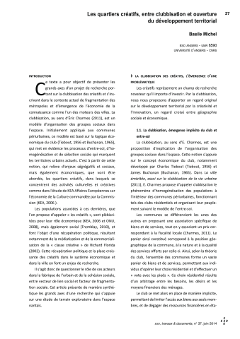 Basile Michel. Les quartiers créatifs, entre clubbisation et ouverture du développement territorial. ESO Travaux et Documents, Espaces et SOciétés - UMR 6590, 2014, 37, pp. 27-34. ⟨halshs-01992981⟩