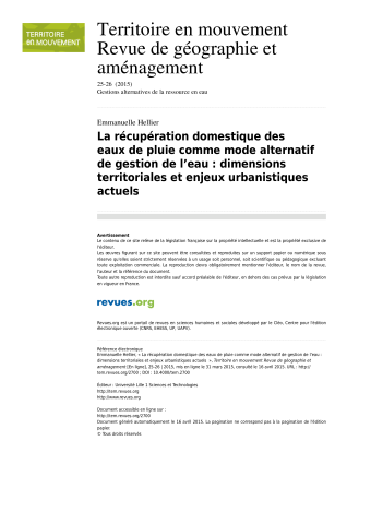 Emmanuelle Hellier. La récupération domestique des eaux de pluie comme mode alternatif de gestion de l’eau : dimensions territoriales et enjeux urbanistiques actuels. Territoire en mouvement.Revue de Géographie et d'Aménagement, Université des Sciences et Technologies de Lille, 2015, Gestions alternatives de la ressource en eau, 25-26/2015, ⟨10.4000/tem.2700⟩. ⟨halshs-01266680⟩