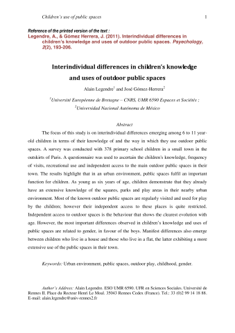 Alain Legendre, José Gómez Herrera. Interindividual differences in children's knowledge and uses of outdoor public spaces. PsyEcology. Revista Bilingüe de Psicología Ambiental / Bilingual Journal of Environmental Psychology, Taylor & Francis, 2011, 2 (2), pp.193-206. ⟨halshs-00713018⟩