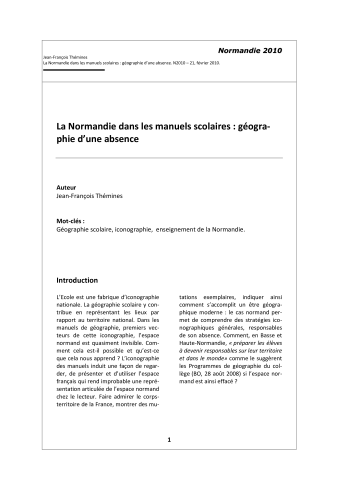 Jean-François Themines. La Normandie dans les manuels scolaires : géographie d'une absence. Etudes normandes, Association Études Normandes, 2011, pp.57-65. ⟨halshs-00840471⟩