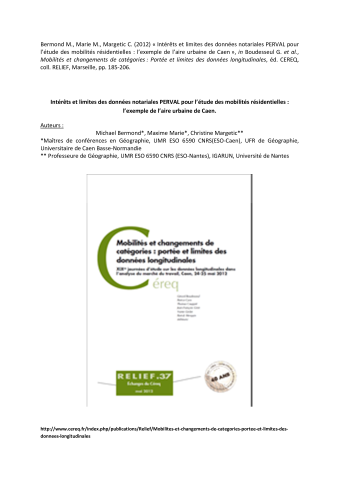 Michaël Bermond, Maxime Marie, Christine Margetic. Intérêts et limites des données notariales PERVAL pour l'étude des mobilités résidentielles : l'exemple de l'aire urbaine de Caen. Relief - Rapports et Échanges sur les liens Emploi Formation, CEREQ, 2012, Mobilités et changements de catégories, pp.185-206. ⟨halshs-00711513⟩
